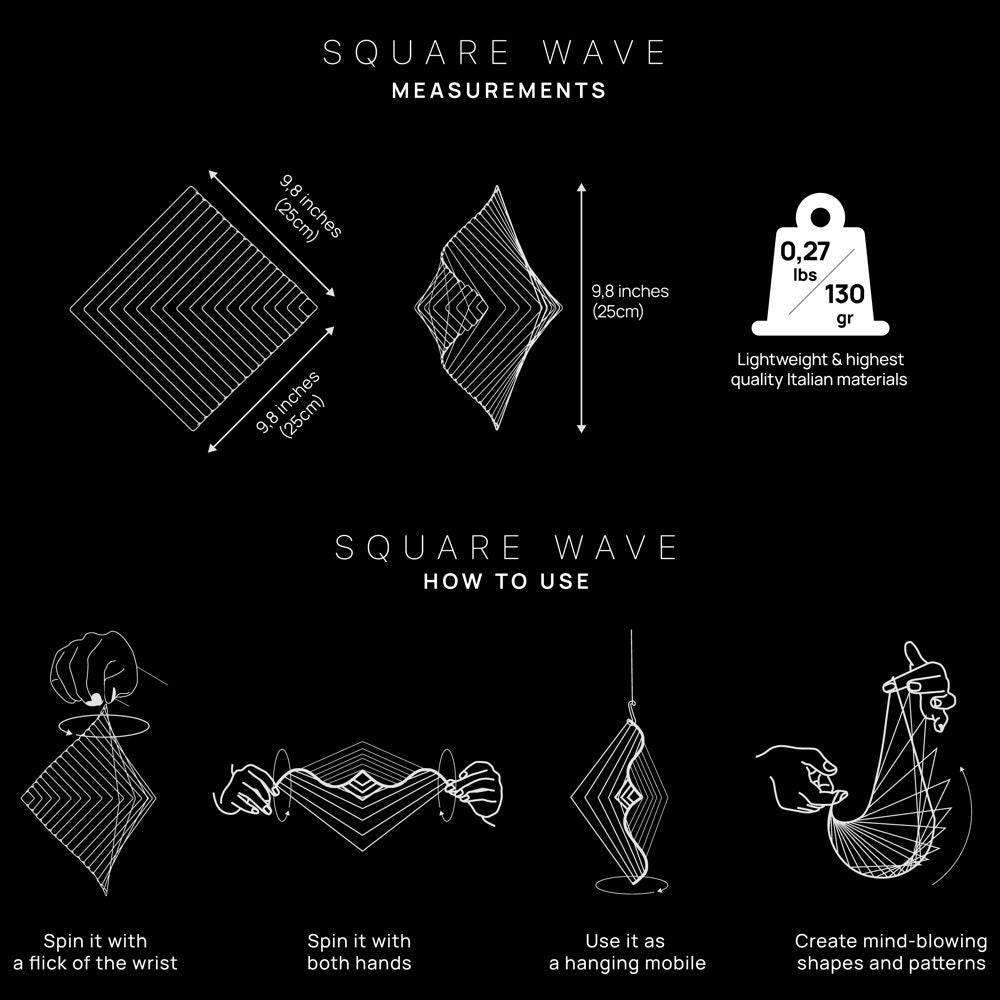 Square Wave was originally created as an artistic sculpture long before it was considered to be a relaxing, mind focusing dynamic kinetic spinner. When not in use, it adds and element of elegance to any style interior whether it be modern, classic or vintage. Square Wave is the perfect accent for every room in your home or office. Its beauty is timeless and it never seems out of place. You can hang it from the ceiling as kinetic sculpture or play with it whenever you feel like it. Square Wave is a truly rare and unique example of originality combined with stunning design.