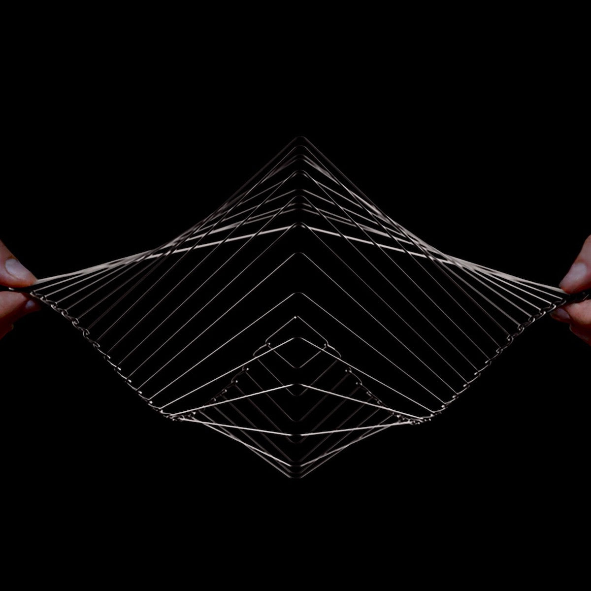 Square Wave is made up of 21 connected metal rods which curve and mutate unexpectedly with the introduction of energy. The repetition of identical elements is precisely calibrated to create complex fluid structures.
